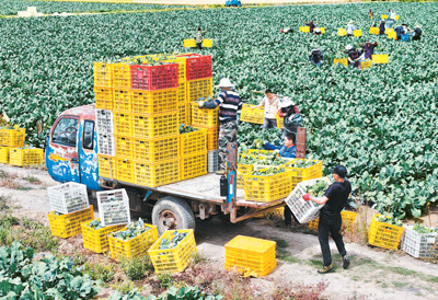 安徽省亳州市蒙城县板桥集镇双鹿村蔬菜基地内,农民正在采收西蓝花,准备供应市场。