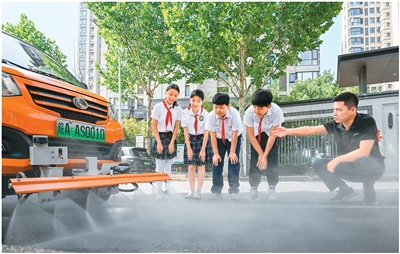 日前,安徽合肥庐阳城市发展集团有限公司举行开放日活动,邀请30名小学生走进公司,了解数字化智慧城管建设,实地体验智慧城管系统、车辆为城市管理工作带来的便捷。图为小学生们正在观摩智能道路清扫车作业。