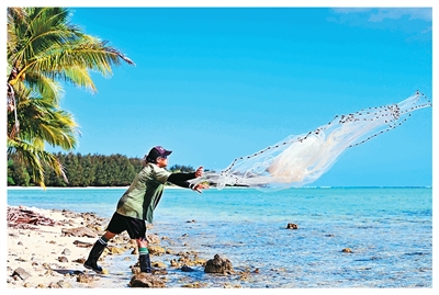 在库克群岛的拉罗汤加岛,当地人在一处潟湖中捕鱼。