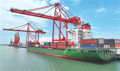 7月2日,山东东营港一突堤集装箱码头建成启用,东营港正式迈入专业化集装箱运输时代,为东营市海洋经济高质量发展注入澎湃动能。该码头水工结构按照靠泊10万吨级集装箱船舶设计建设,年通过能力可达30万标箱。图为集装箱船舶靠泊在该码头。