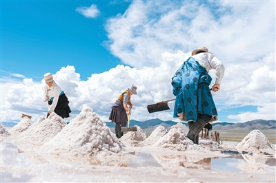 西藏自治区阿里地区革吉县盐资源丰富。为促进村民增收,当地建起了粗盐加工厂,逐步形成采盐、储存、加工、包装和销售于一体的产业链。2018年,革吉驮盐习俗被列入西藏自治区非物质文化遗产代表性项目名录。图为近日,革吉县牧民在采盐。