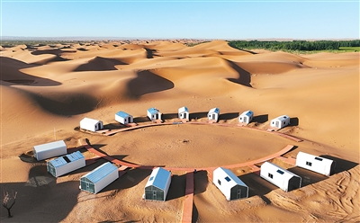 甘肃省张掖市临泽县充分利用地处巴丹吉林沙漠边缘的独特资源优势,大力发展露营经济,激活消费新动能。图为近日拍摄的临泽县板桥镇金沙湾旅游景区的露营基地。