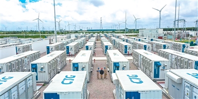 近年来,国网江苏如东县供电公司构建以新能源为主体的新型电力系统。如东县已投入使用3座储能电站,新型储能并网总量达55万千瓦,每天可向电网放电近200万千瓦时。图为工作人员在江苏丰储共享储能电站巡检设备。