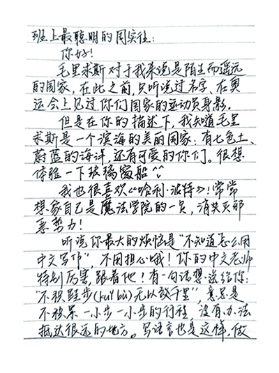 “毛里求斯对我来说是陌生而遥远的国家,在此之前只听说过名字,在奥运会上见过你们国家运动员的身影。但在你的描述下,我知道毛里求斯是一个滨海的美丽国家:有七色土、蔚蓝的海洋,还有可爱的你们。”