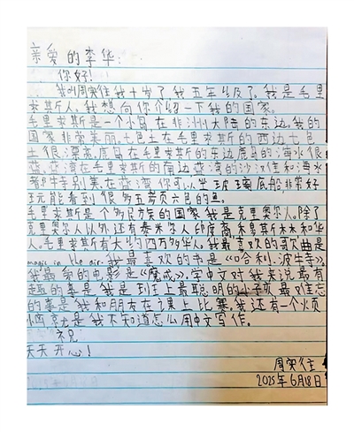 “你们愿不愿意也给中国人写一封信,向他们介绍毛里求斯呢?”我问孩子们。他们惊喜地睁大了眼睛,连连点头难掩兴奋。于是,我花了1周时间带领他们认认真真地复习所学;做好准备后,孩子们用了3节课的时间,一笔一画地把想说的话工整誊写在信纸上。看着他们久久地坐住板凳,我既为他们的刻苦努力而骄傲,又被他们渴望跨文化交流的诚挚心意深深打动。