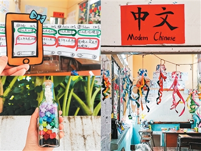 创意手工是我为孩子们打开中文兴趣大门的钥匙:我们一起绘画、裁剪,制作“纸质手机”,模拟朋友之间的中文聊天;把写满“越来越……”心愿的纸条折成幸运星,装满一个漂流瓶;制作五彩斑斓的“水母”,在纸带上记录各自心情……