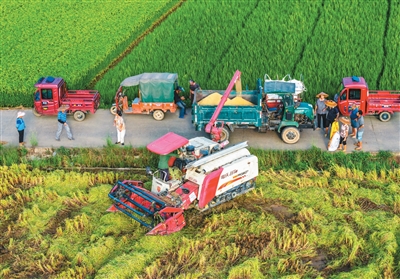 南方各省中稻迎来丰收季,当地农民抢抓农时,为丰产增收打好基础。图为九月十日,湖南省永州市东安县紫溪市镇大源村,农民使用农机收获中稻。
