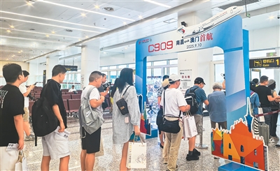 9月10日,中国国产客机C909首条地区航线——南昌至澳门航线开通,由C909客机执飞的MU865航班从南昌昌北国际机场起飞,飞往澳门国际机场。图为旅客在检票登机。