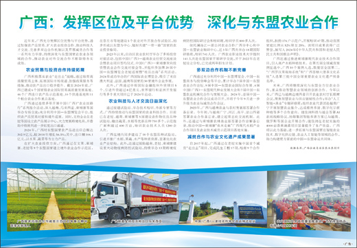 广西通过充分利用中国—东盟博览会、中国—东盟商务与投资峰会等平台,累计举办7届中国—东盟农业合作论坛、9届中国—东盟农业国际合作展、4届中国(广西)—东盟现代种业发展大会和7届中国—东盟农业机械化合作与发展大会。2024年,首届中国—东盟农业合作会议成功召开,并将于今年9月进一步升级为农业与减贫合作会议。
