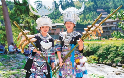 9月13日,广西壮族自治区融水苗族自治县安太乡培秀苗寨举行“秀美培秀·苗韵金秋”烧鱼季启动仪式,通过各种趣味活动庆祝丰收。图为当地村民展示刚串好的禾花鱼。
