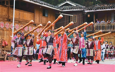 日前,贵州省从江县翠里瑶族壮族乡高华瑶寨举办“盘古王丰收节”活动。图为瑶族群众表演长鼓舞。