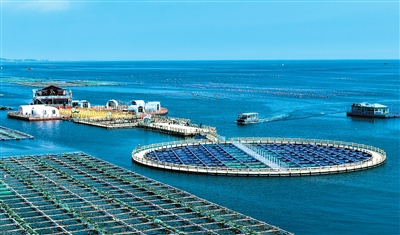 山东省近年来积极拓展耕海牧渔空间,释放“蓝色粮仓”潜力,“海上山东”新蓝图正徐徐铺展。图为游客乘坐游船在山东省荣成市石岛管理区桑沟湾海洋牧场游玩。