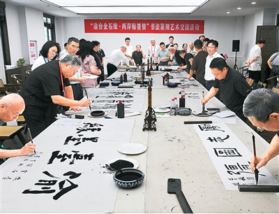 “渝台金石缘·两岸翰墨情”书法篆刻艺术交流活动近日在重庆举办,吸引来自台湾篆刻家协会的13名艺术家参与。图为渝台两地艺术家现场挥毫泼墨。