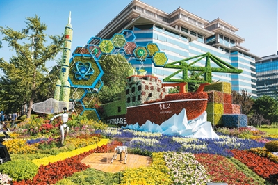 近日,北京长安街沿线以“奋进新征程、建功新时代”为主题的10组立体花坛精彩亮相,成为游客的热门打卡地。图为在长安街拍摄的“科技强国”花坛。