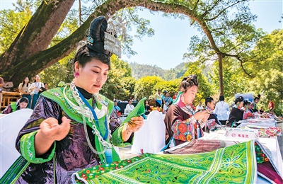 日前,贵州省黔东南苗族侗族自治州从江县举行“锦绣凝匠心·巧手展芳华”刺绣技能大赛,绣娘齐聚一堂同台竞技。近年来,从江县把刺绣非遗文化优势转换为指尖产业优势,帮助绣娘拓宽增收渠道,助力乡村全面振兴。图为比赛现场。