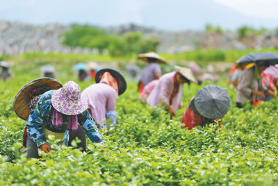 采花工人在位于福州永泰县的春伦茉莉花基地采摘茉莉花。 |