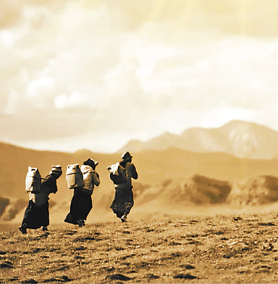2010年,德吉村所在地还是一片荒滩。图为山上的村民到山下去背水。 |
