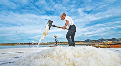 10日,福建泉州,盐工们赶在台风到来前抢收原盐。 |