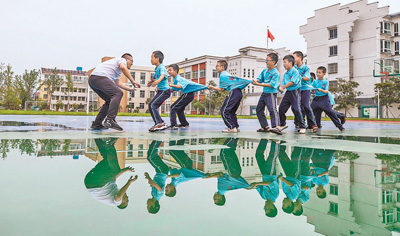 图为日前,在魏营镇中心小学操场上,老师带着暑托班的孩子们做游戏。