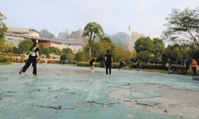日前,笔者在浙江开化县城体育馆附近的广场看到,这里的地面坑坑洼洼,已经严重损毁(见图三)。每天早上,这里有不少市民打羽毛球、健身,晚上也有百余人在这里跳广场舞,不但活动体验不好,而且很容易摔倒扭伤。