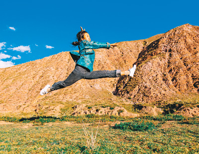 9月17日,艺术团成员加羊吉在练习舞蹈跳跃动作。 |