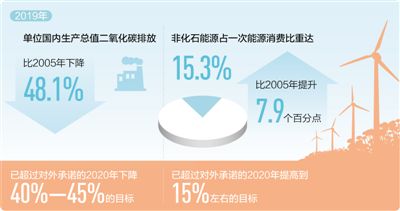过去10年,应对气候变化,中国有一份亮眼的成绩单。2019年,单位国内生产总值二氧化碳排放比2015年、2005年分别下降18.2%、48.1%,已超过对外承诺的2020年下降40%—45%的目标,基本扭转碳排放快速增长的局面;2019年,非化石能源占一次能源消费比重达15.3%,比2005年提升7.9个百分点,也已超过对外承诺的2020年提高到15%左右的目标;2018年,森林面积、森林蓄积量分别比2005年增加4509万公顷、51.04亿立方米,成为同期全球森林资源增长最多的国家。通过不断努力,中国已成为全球温室气体排放增速放缓的重要力量。