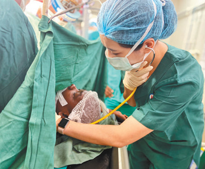 中国第二十二批援莫桑比克医疗队队员为手术中的病患监测体征。 |