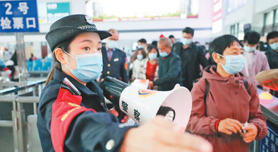 10月6日,一名铁路公安民警在山西运城北站进站口维持秩序。 |