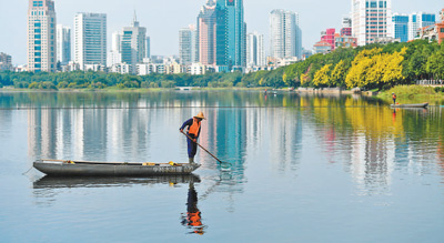 10月2日,工人在广西南宁市南湖进行水面保洁。 |