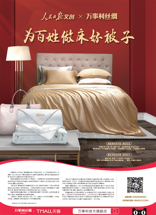 伴随着丝绸文化不断发展传承,如今的桑蚕丝产品不仅拥有深厚的文化理念,更融入了先进的生产手段和互联网技术。人民日报文创与万事利丝绸携手推出的“美好生活”高端蚕丝秋冬被及“湖光秋月”真丝床品四件套两款产品,在兼顾品质与性价比的同时,更成为助推文化创意产业蓬勃发展的又一有力实践。