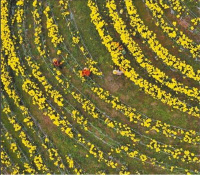 金秋时节,安徽省黄山市徽州区唐模村菊花基地的金丝皇菊进入采摘期。图为唐模村菊农在采摘金丝皇菊。