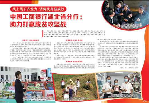 今年,工商银行湖北省分行共计完成消费扶贫980万元,提前完成全年消费扶贫任务,比2019年全年实际消费扶贫额增长120.6%,有力地支持了贫困地区农产品的销售。