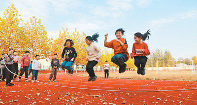近日,山东省高密市姜庄镇老屯小学举行“传统游戏回归校园”活动,小学生们利用体育课和大课间玩丢手绢、跳长绳、踢毽子等传统游戏。
