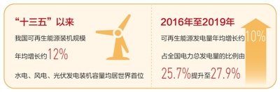 水流奔涌而下、风机呼呼转动、光伏板熠熠生辉……“十三五”以来,我国可再生能源装机规模年均增长约12%,水电、风电、光伏发电装机容量均居世界首位;截至2019年,煤电装机占全国电力总装机容量的比例为51.95%,较2015年下降7.05个百分点。能源供应体系正由以煤炭为主向多元化转变,可再生能源逐步成为新增电源装机主体。