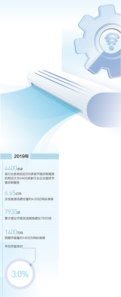 近两年,节能诊断服务不断发展。“2019年,各行业各地区的200多家节能诊断服务机构总计为4400余家行业企业提供节能诊断服务,涉及能源消费总量约4.65亿吨标准煤,累计提出节能改造措施建议7930项,预期节能量约1400万吨标准煤,平均节能率约3.0%。”工信部节能与综合利用司有关负责人说。