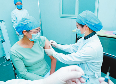 图为1月3日,北京大兴区瀛海镇中心卫生院医护人员正在接种疫苗。