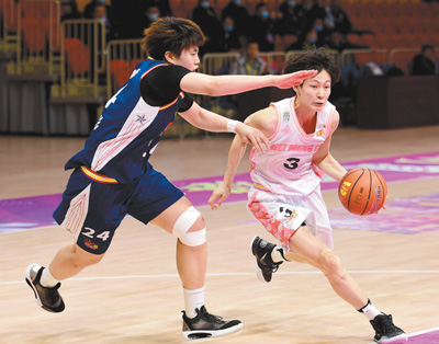 1月3日,内蒙古女篮球员杨力维(右)在比赛中带球突破。