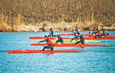 1月18日,皮划艇运动员在江苏省镇江市金山湖上进行训练。自2020年12月起,这批来自苏州市的皮划艇静水项目选手在金山湖开展为期半年的训练,运动员把训练场当作赛场,磨炼意志、提高成绩。据了解,皮划艇静水项目是皮划艇项目的一个分项,在平静的水道里进行比赛,与皮划艇激流回旋项目相对应。