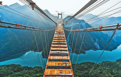 目前,贵(阳)黄(平)高速公路阳宝山特大桥建设已进入钢桁梁吊装收尾阶段。阳宝山特大桥位于贵州省黔南布依族苗族自治州贵定县境内,全长1112米,主跨650米。图为3月17日拍摄的阳宝山特大桥。