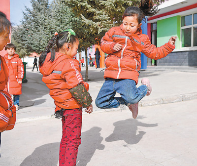 图为3月15日拍摄的大坪小学学生在课间跳皮筋。