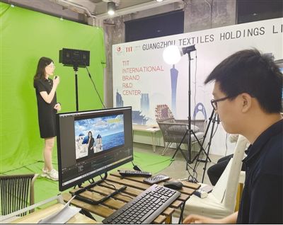 4月15日,广州纺织工贸企业集团有限公司工作人员运用绿幕进行广交会直播。 |