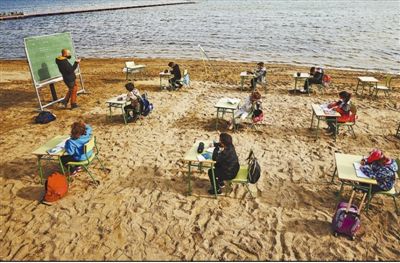 为防范新冠肺炎疫情,西班牙卡塔赫纳附近的一所学校将课堂搬到沙滩上,让学生们呼吸新鲜空气,避免室内聚集。图为近日,一名老师在西班牙卡塔赫纳附近的沙滩上为学生授课。