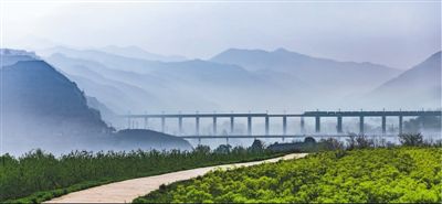 4月12日,河南三门峡卢氏县,一列运煤专列从浩吉(内蒙古浩勒报吉至江西吉安)铁路范里河大桥上驶过。浩吉铁路全长1813.5公里,途经7省份,一跨长江、两越黄河,是我国纵贯南北的能源运输大通道。