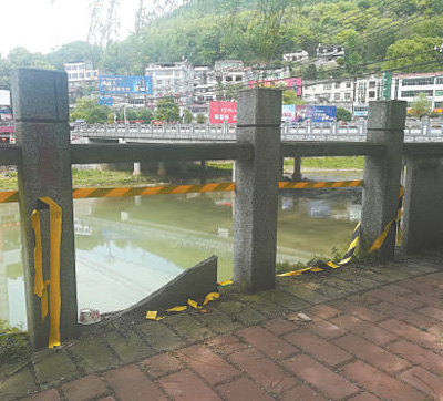在湖北通山县太平大道月亮湾靠近新城桥头的城河河堤,不少石板护栏破损或遭到人为毁坏,很长时间没有处理(见图二)。