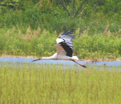 2005年初夏,“八五郎”再次飞回该市,停留在户岛地区的一片水稻田里。群生的雨久花绽放出一朵朵紫色的花朵,白鹳在其间悠闲地觅食,犹如一幅画卷铺展开来。许多当地居民表示,“这么美的风景,应该保留下来。”
