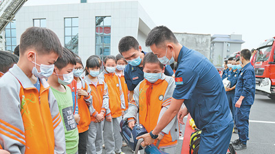 日前,江西省萍乡市消防救援支队消防员在教学生们使用消防器材。据了解,该支队在“我为群众办实事”实践活动中,成立“火焰蓝”助学基地,并先后投入130余万元,用于帮扶该地区贫困学生。