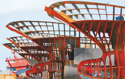 浙江省温岭市持续推进船舶修造业转型升级,提升产品制造绿色水平,新造船舶订单稳健增长。图为7月7日温岭市礁山港,正在施工的船舶主体结构。