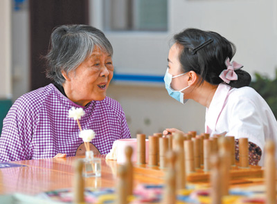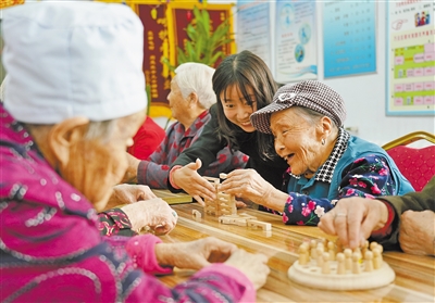 河北省张家口市万全区孔家庄街道气象后街社区,阳光家园托养中心工作人员在陪老人玩益智游戏。