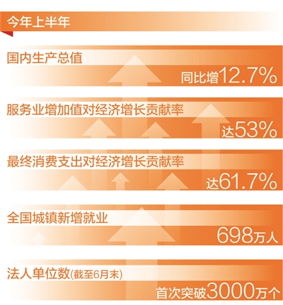 就业稳定,创业火热,城乡居民人均可支配收入比值缩小。上半年,城乡居民人均收入比值2.61,比上年同期缩小0.07;全国城镇新增就业698万人,完成全年目标的63.5%。6月末,据国家统计局基本单位名录库统计,法人单位数首次突破3000万个,同比增长16.6%。