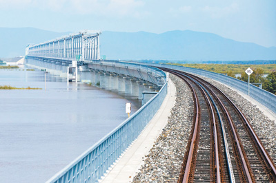 同江中俄黑龙江铁路大桥位于中国黑龙江省同江市与俄罗斯下列宁斯阔耶市之间,桥梁全长约7194米,主桥长约2215米,其中中方境内主桥长约1886米,设计运营时速100公里、年过货能力2100万吨。